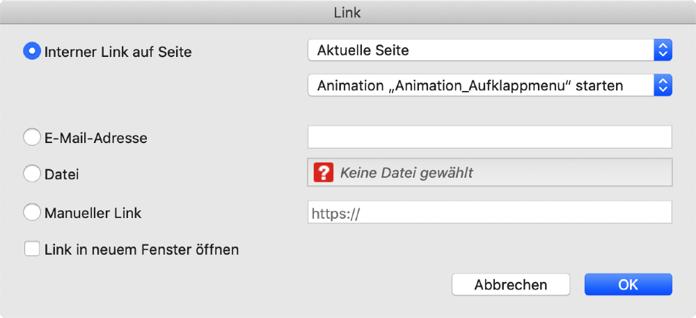 Klicke jetzt auf den Button und wähle in der rechten Seiten neben der Option "Als Link verwenden" die Animation aus. Im erscheinenden Fenster wählst du unter "Interner Link auf Seite" deine aktuelle Unterseite und deine gerade erstellte Animation aus.